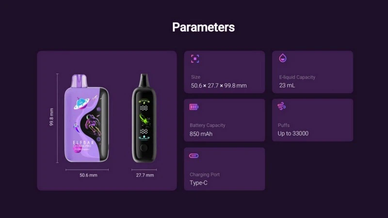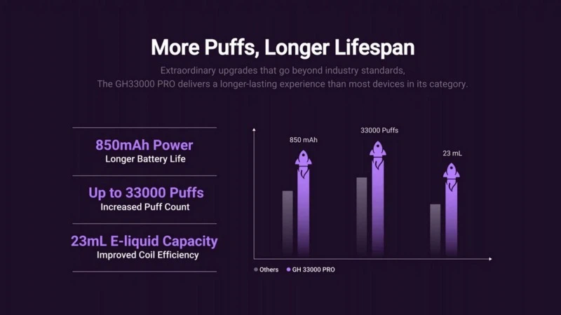 Elfbar GH33000 PRO je vybaven baterií 850 mAh a působivou kapacitou 23 ml e-liquidy, což umožňuje rozšířené používání bez častých náplní. Je to ideální volba pro ty, kteří hledají dlouhotrvající, spolehlivý zážitek.